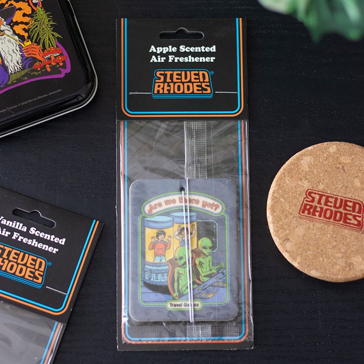 Your passengers are annoying, the traffic is endless and your GPS is lying. At least your car can smell like something other than despair. The Are We There Yet air freshener by Steven Rhodes is an apple-scented escape in a bag. Officially licensed and part of the Steven Rhodes collection of iconic retro gifts.