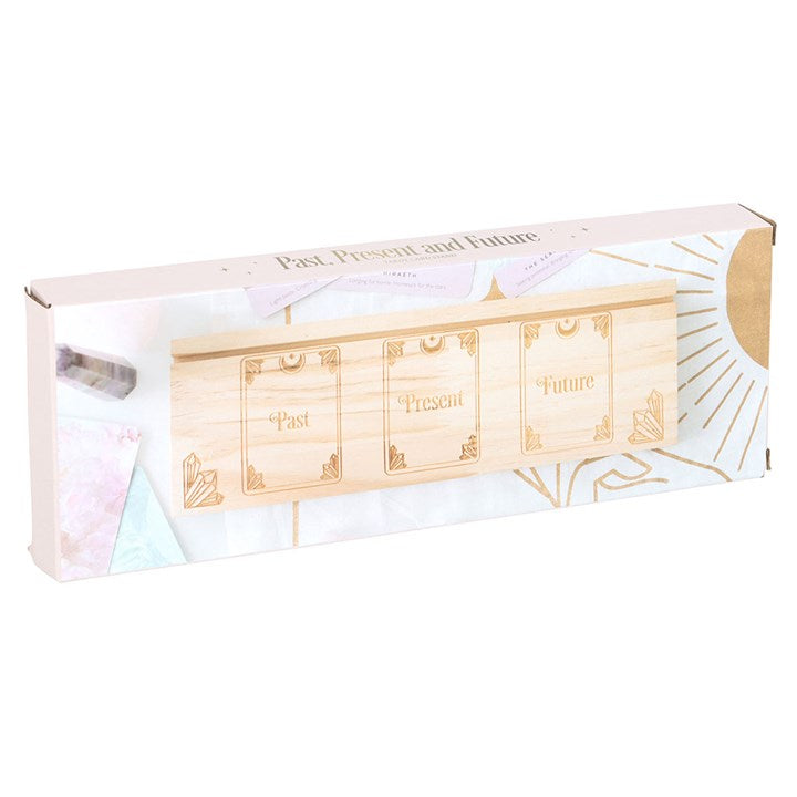 Display tarot card readings with this wooden tarot card stand, complete with a past, present and future design, allowing the meaning of the cards to fully resonate. Whether it's used for displaying treasured tarot cards for their meaning or their unique design, this piece will add mystical allure to any home.