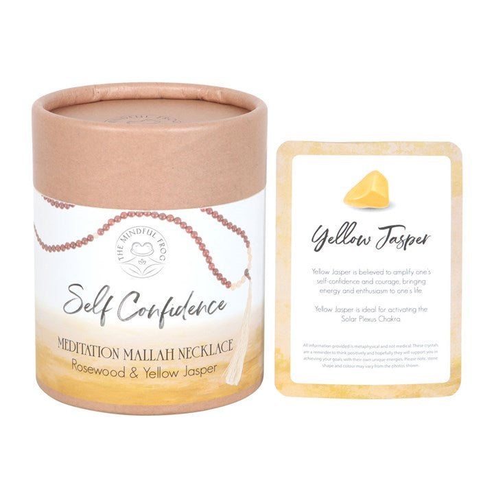 Crafted from rich, warm rosewood beads and interlaced with vibrant Yellow Jasper stones, this elegant necklace showcases 108 beads — a traditional number in Mallah necklaces symbolizing spiritual journey and mindfulness — and is finished with a decorative tassel. The Yellow Jasper, known for its association with the solar plexus chakra, is believed to amplify self-confidence and courage. It is said to attract energy and enthusiasm, empowering the wearer with a sense of boldness and assertiveness. A Mallah, or Mala, necklace is a string of beads traditionally used in meditation and prayer in various spiritual practices including Buddhism and Hinduism. Each bead represents a repetition of a mantra or prayer, aiding in focus and spiritual contemplation. To use simply hold the necklace in one hand and move from bead to bead whilst focusing on mindful breathing and repeating an intention. The necklace can be worn throughout the day as a reminder of these intentions. Each Mallah Necklace is presented in a beautifully designed box, accompanied by a corresponding information card, making it an ideal and thoughtful gift for a loved one seeking to boost their self-assurance and personal power.